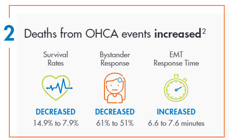 2. Deaths from OHCA events increased. Survival rates decreased from 14.9% to 7.9%. Bystander response decreased from 61% to 51%. EMT response time increased from 6.6 to 7.6 minutes.