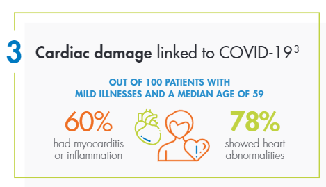 3. Cardiac damange linked to COVID-19. Out of 100 patients with mild illnesses and a median age of 59, 60% had myocarditis or inflammation. 78% showed heart abnormalities.