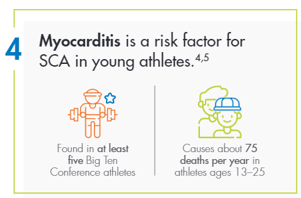 4. Myocarditis is a risk factor for SCA in young athletes. Found in at least five Big Ten Conference athletes. Causes about 75 deaths per year in athletes ages 13-25.
