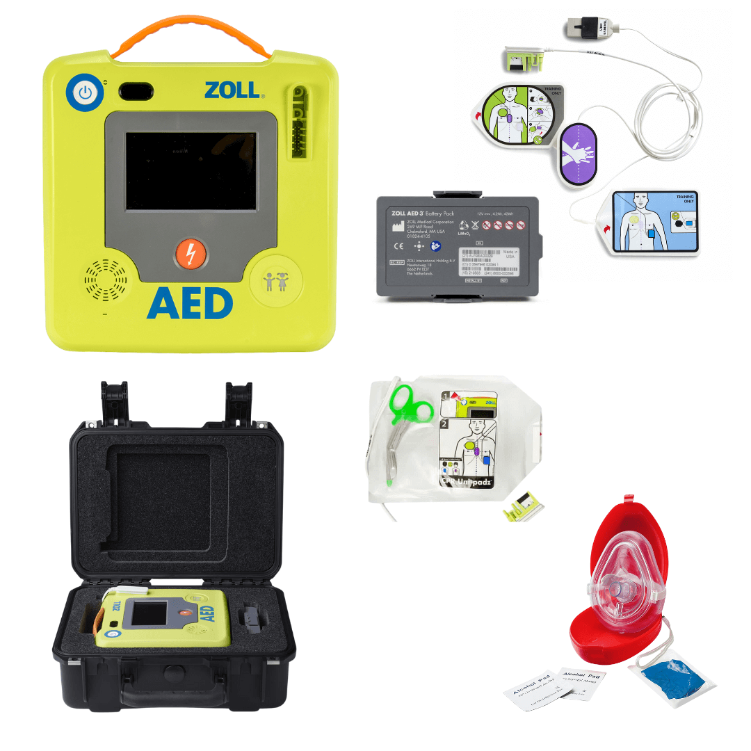 • ZOLL AED 3 – Includes CPR Uni-Padz electrodes, non-rechargeable lithium battery, and an eight-year manufacturer’s warranty.