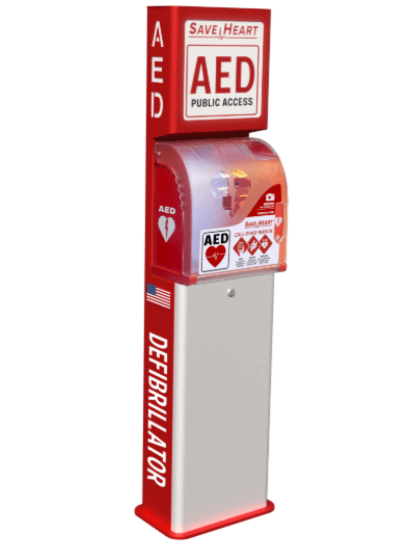 The SaveHeart Outdoor 300 VHM Tower Cabinet is a free-standing Tower made in the USA from durable aluminum with a weather resistant powder coat finish that includes an alarm system, ventilation, heating and monitoring, among these other features.